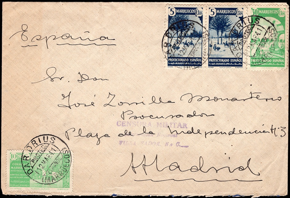 En la que veo que la censura de Villa Nador no lleva número de censor. ¿Es normal que una carta fechada en Dar Drius y dirigida a Madrid lleve una censura de Villa Nador?