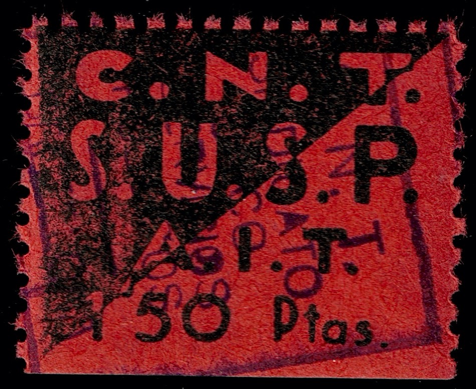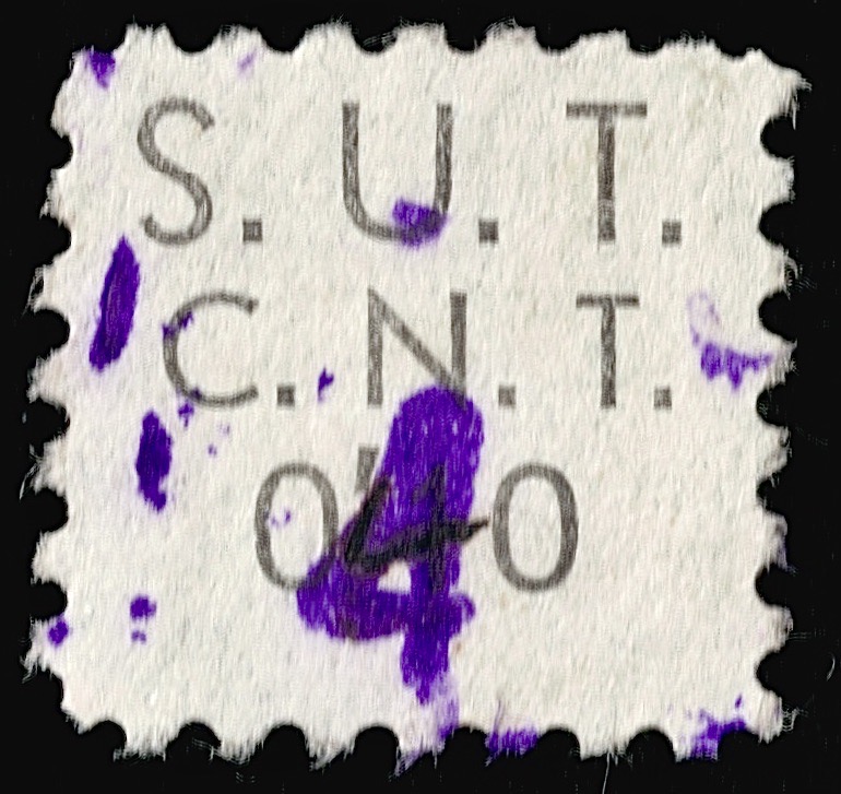 La primera es del Sindicato Único de Transportes (dentado 11 1/2, 14 mm x 13 mm). Es interesante porque fue sobrecargada dos veces, a mano con tinta negra de 0,10 pta a 0,40 pta (el 1 cambiado en 4), y luego con el 4 morado estampado.