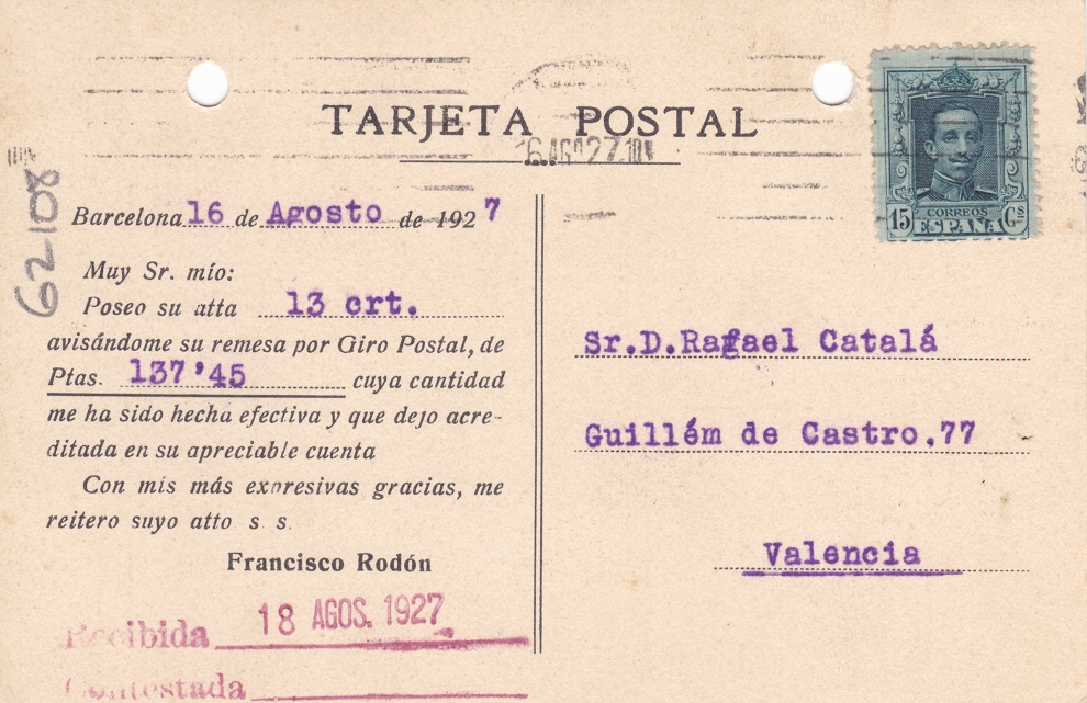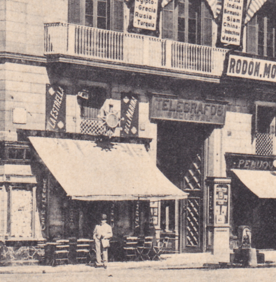 Compre esta tarjeta postal para mi colección de Vaquer y mi sorpresa al ponerle la lupa es que aparte del comercio que la edita aparece una filatelia (sellos antiguos de correos para colecciones) y una oficina de telégrafos, para mí una verdadera ambrosía. ¿de que comercio filatélico se trata? Esto lo buscas y jamás lo encuentras y por casualidad te entra.
