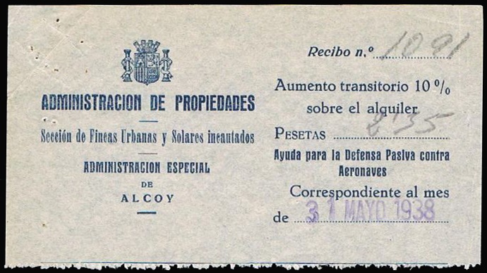 Siguiendo la costumbre de incluir las viñetas aunque no sean de su uso en cartas, y aunque muchos ya la conoceréis, en Alcoy se utilizaron éstas, por la Junta Local de Defensa Pasiva contra Aeronaves, en Alcoy, como impuesto transitorio del 10% sobre alquileres, con valores de 0,10, 0,25, 0,50, 1 y 2 ptas.