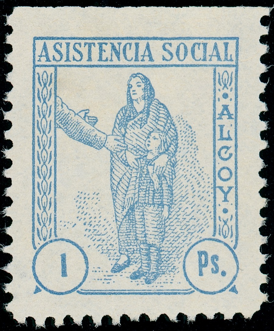 Reproduzco la 2 variantes del 50 cts.rojo de la Asistencia Social de Alcoy, que no sé si conocerás la fina. Fue otra edición. Y la palabra Cts. también cambia. Con mi edad y salud, decidí deshacerme de mis colecciones de viñetas, rodillos, postales, sellos, etc. ya que mis hijos no quieren saber nada de coleccionismo, y que lo saque todo.