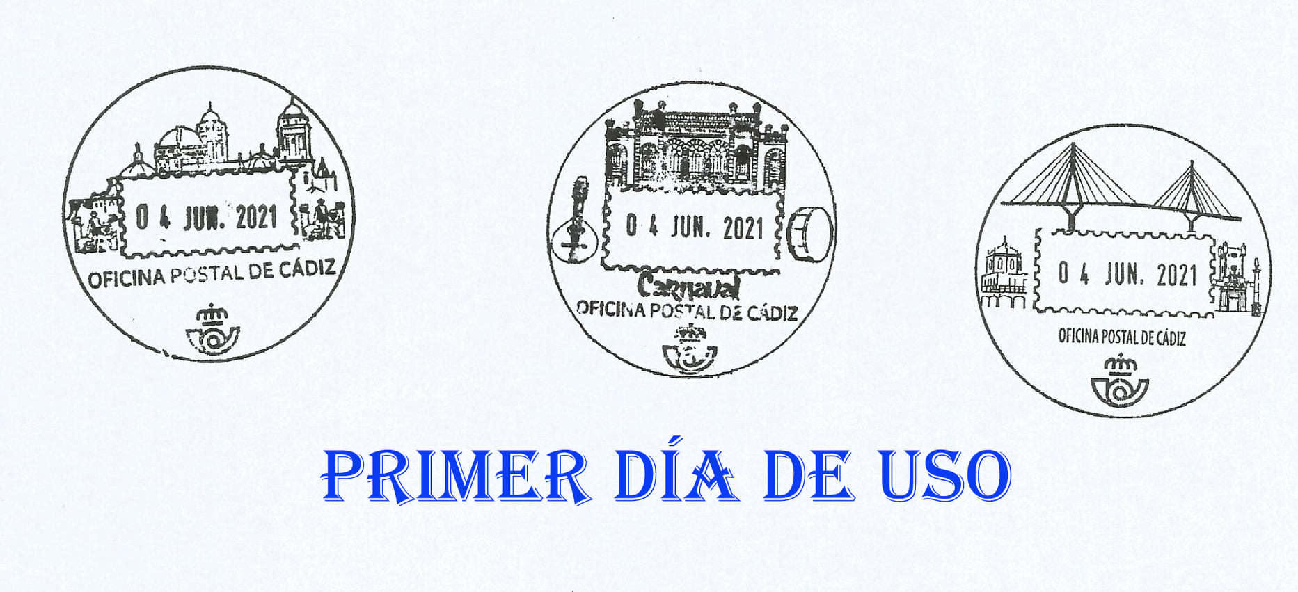 Hoy viernes 4 de junio, ya se encuentran, de nuevo, en la Oficina Principal de Correos de Cádiz, los tres matasellos turísticos de Cádiz. En los de la Catedral y el Carnaval, desaparecen la palabra CORREOS y se actualiza el logo de Correos.