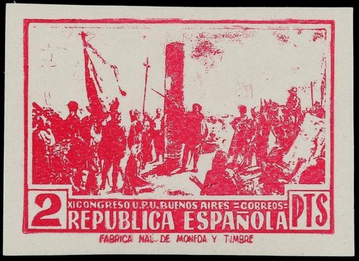 "ESPAÑA. NO EMITIDOS. XI CONGRESO U.P.U. DE BUENOS AIRES. Sellos de 2 pts. lila sobre papel engomado sin dentar y 2 pts. azul sobre papel gris con hilos de trapo sin dentar. EXTRAORDINARIAMENTE RAROS, del sello lila se conocen dos ejemplares y el sello azul es el único conocido. Conjunto excepcional, descubierto hace solo unos pocos años. Se trata sin duda de las piezas más importantes existentes del período, siendo los últimos sellos emitidos por la Fábrica Nacional de Moneda y Timbre antes de la caída de Madrid. Cert. CEM. NOTA: Al parecer se programó durante los últimos días de la República la emisión de cuatro sellos de valores de 2 pts., 5 pts., 10 pts. y 45 cts. conmemorando el Congreso de la U.P.U. a celebrar en Buenos Aires en Abril de 1939. Esta emisión no se llegó a realizar por finalizar la Guerra Civil y solo se han conservado unos bocetos originales y estos dos únicos sellos reseñados en un trabajo realizado por el Sr. Germán Baschwitz y publicado por la Academia Hispánica de Filatelia."