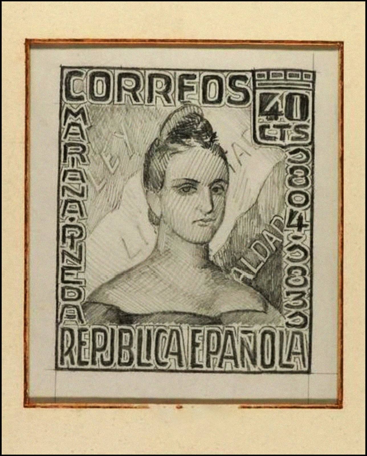 Copio descripción de la casa de subastas: Proyecto original a lápiz con facial de 40 cts. y prueba fotográfica del diseño adoptado, en un marco de época con la firma original del Grabador José Luis Sánchez Toda.