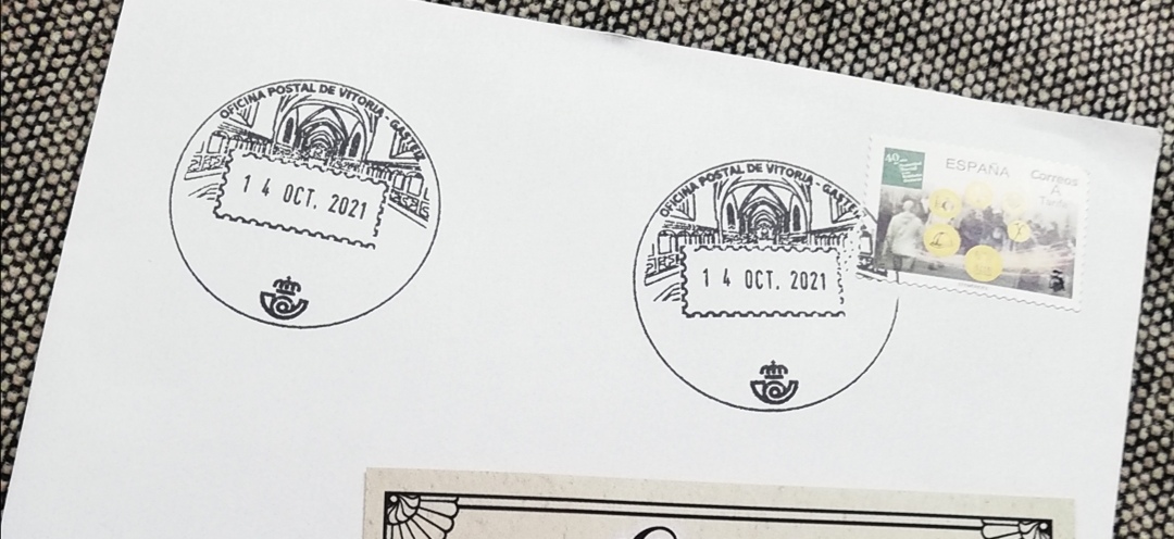 Carta recibida ayer con matasello turístico de Vitoria - gasteiz sin la palabra Correos, y si se descuidan no ponen nada salvo el dibujo (tremendo hueco en blanco) eso sí, muy bonito