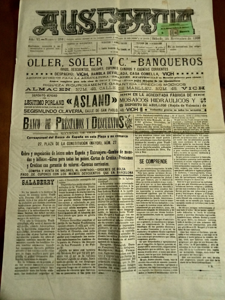 Lote 23- 23:30. PERIODICO AUSETANIA, franqueado. Año 1905
