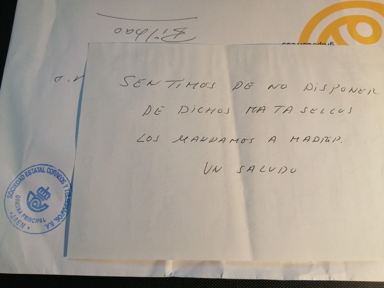 he solicitado en diciembre de este año, 2022, otra vez los mtur, y me devuelven los sobres con una nota semejante a la del año `pasado: "sentimos de no disponer de dichos matasellos los mandamos a madrid. Un saludo"