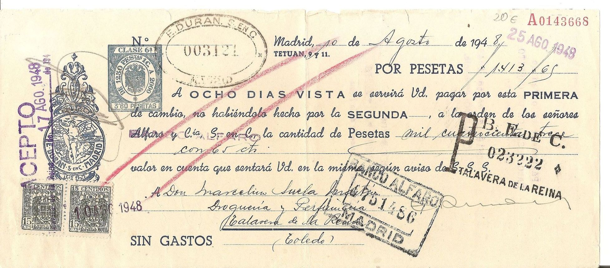 Letra de cambio E. Durán de Madrid.
