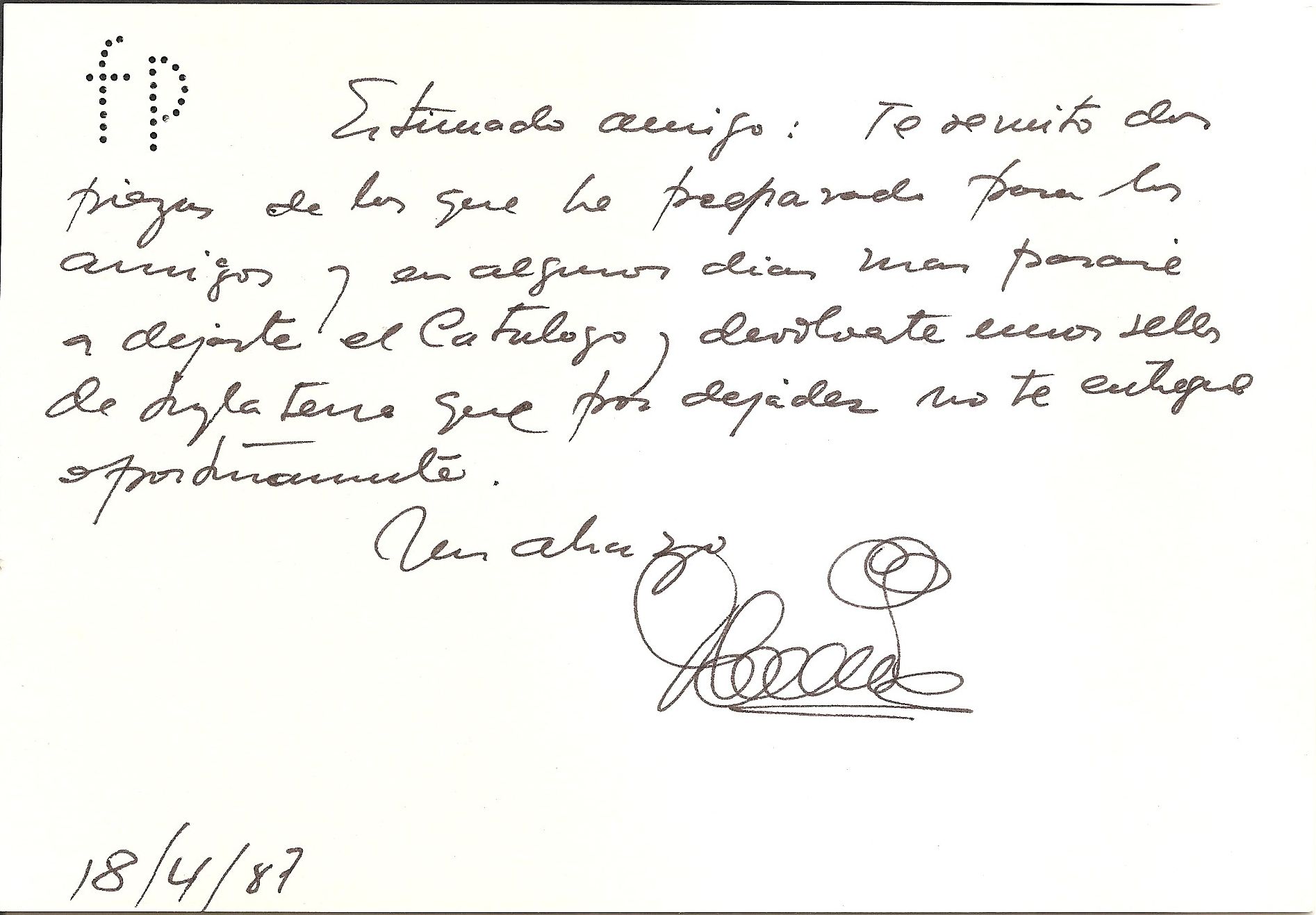 FP Florentino Pérez, sobre y targeta agradeciendo a Gimenez Morata la ayuda prestada para hacer el catálogo.