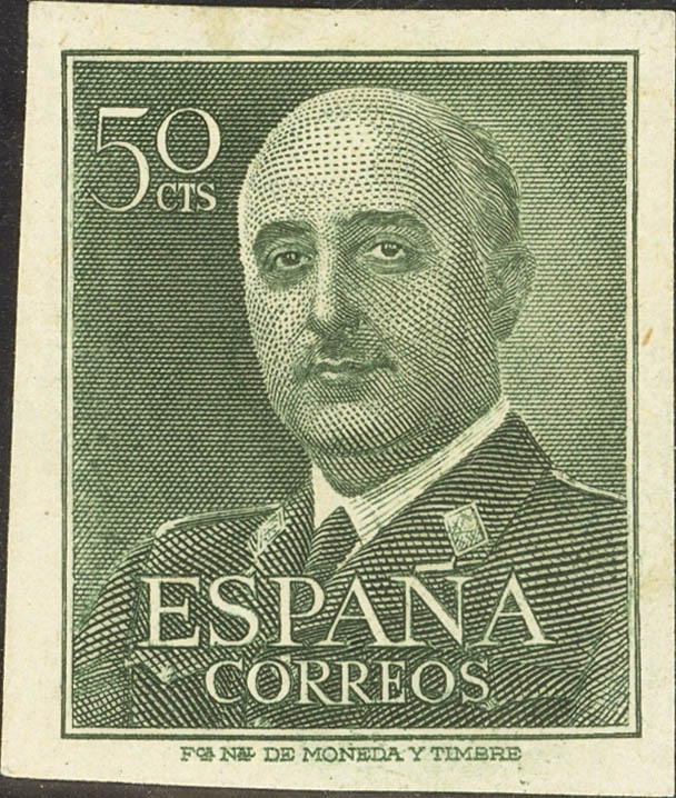 1949. 50 cts verde oscuro. PRUEBA DE PUNZON, de un diseño no adoptado, con la efigie de Franco, realizado para la emisión de 1949 (es la misma que aparece reproducida en el catálogo Gálvez). MAGNIFICA Y EXTRAORDINARIAMENTE RARA. (Gálvez 3670)