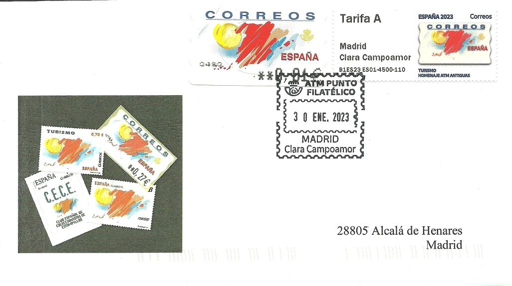 Hoy me han llegado los sobres que deposité el día 30 para circular desde la oficina de Clara Campoamor. Empiezo con un sobre donde quedan reflejados los modelo donde se ve el dibujo "Turismo", ATM del SF de 27 céntimos, Tusello del Club CECE, sello de tarifa de 70 céntimos y otro de tarifa B, el sobre franqueado con el ATM de tarifa A de homenaje a los antiguos ATMs (antiguos pero que se siguen utilizando en oficinitas pequeñas desconectadas del IRIS) y como exceso de franqueo un ATM de los impresos en las antiguas Epelsas, todo matasellado con el matasello conmemorativo del evento.