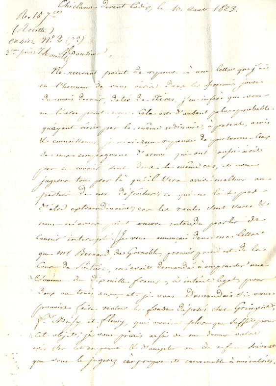 Está fechada en: Chiclana, Avant (delante) Cádiz, le 10 Aout 1823 y dirigida a Grenoble.