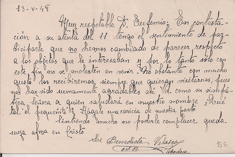 La postal llega sin la anulación del sello, y este es inutilizado con un matasellos, que no con un fechador, como era preceptivo, para evitar la confusión de la procedencia y el tiempo en el envío.
