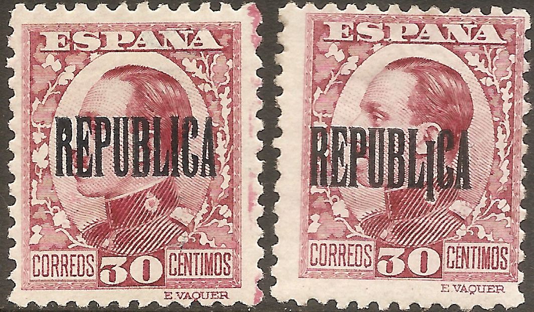 (★)1931. Prueba de sobrecarga REPUBLICA, de la emisión republicana de Barcelona en pliego de cincuenta con las variedades "REPUBLICA" CON ACENTO (Posición 1) y "REPUBLIGA" (Posición 41). MAGNIFICA Y RARISIMA.