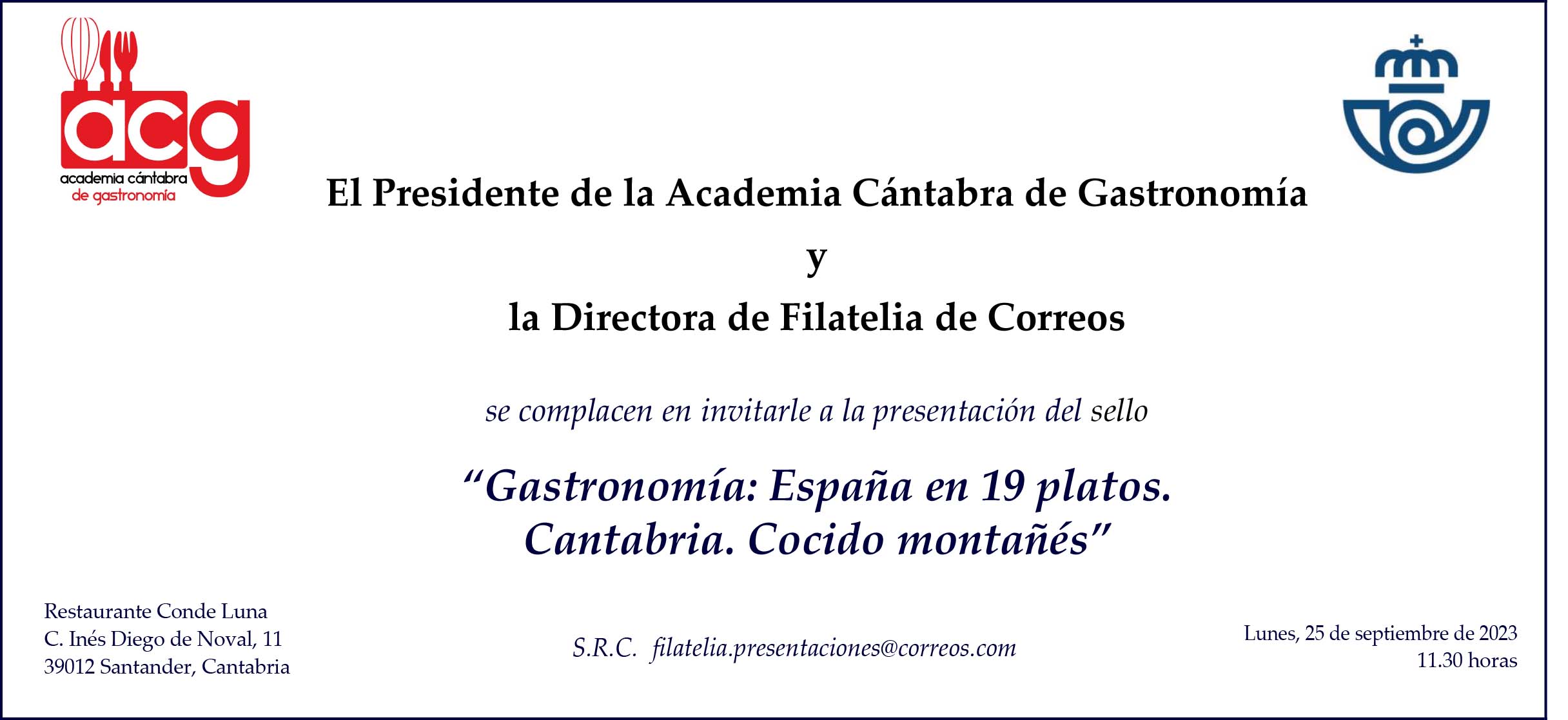 Nos complace invitarle a la presentación del sello “Gastronomía: España en 19 platos. Cantabria. Cocido montañés”, que se celebrará el próximo lunes 25 de septiembre en Santander.