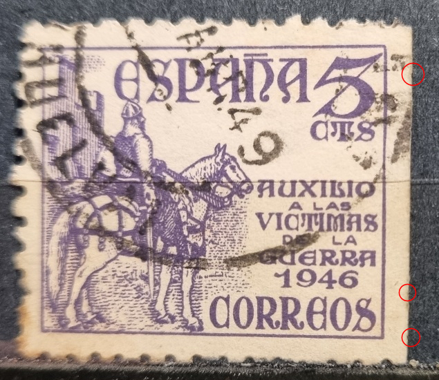 No soy un experto en ésto pero yo miraría bien este ejemplar. Verás los grandes márgenes de éste sello y un ligero descentraje invitan a recortar el dentado para que parezca que no lo está en ese lado.
