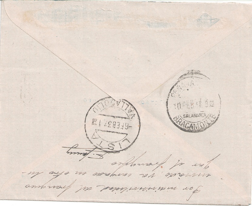 Carta de Burgo de Osma a Salamanca, matasellos puente de Burgo de Osma 3 de febrero de 1937 sobre sello de 2 cts. republicano, marca de *FRANQUEO RECLAMADO* matasellos lista de Valladolid (6 febrero 1937) marca de censura nacional de la comandancia militar de Medina del Campo (Heller M44.1). Al dorso matasellos lista de Valladolid 6 de febrero de 1937 y llegada a Bracamonte 10 de febrero de 1937. Escrito a mano en el remite: “ Por indivisibilidad del franqueo enviado va cargado en otro lugar el franqueo” MUY RARA.