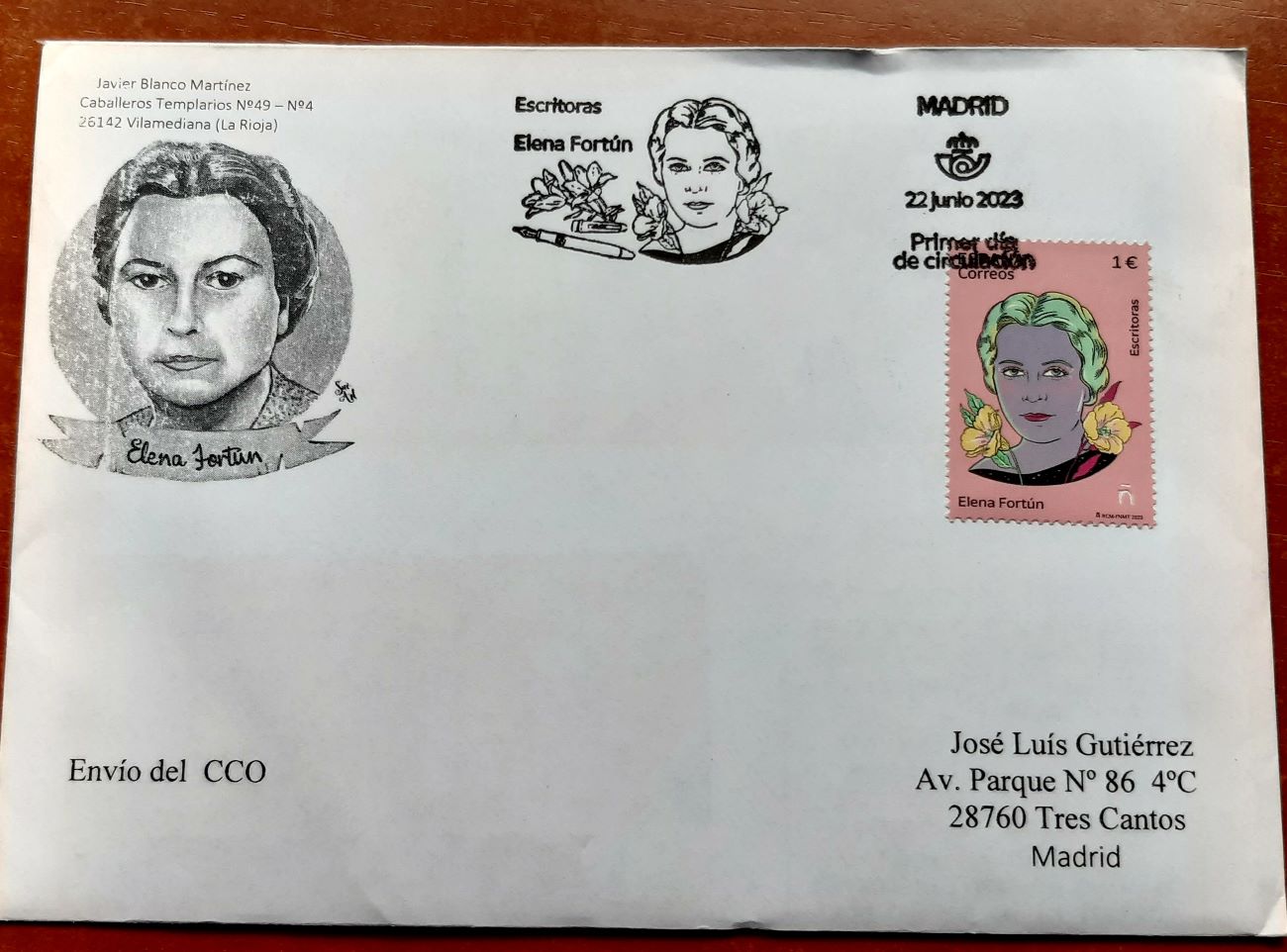 Recibido del amigo Javi precioso sobre con matasellos primer día de Elena Fortún.