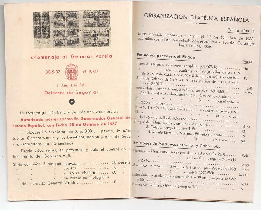 Catálogo de venta de sellos de la “Organización Filatélica Española” de septiembre de 1938. Contiene un listado de las emisiones locales, sobrecargas patrióticas con los precios del momento. Editado por la librería Herranz de Segovia