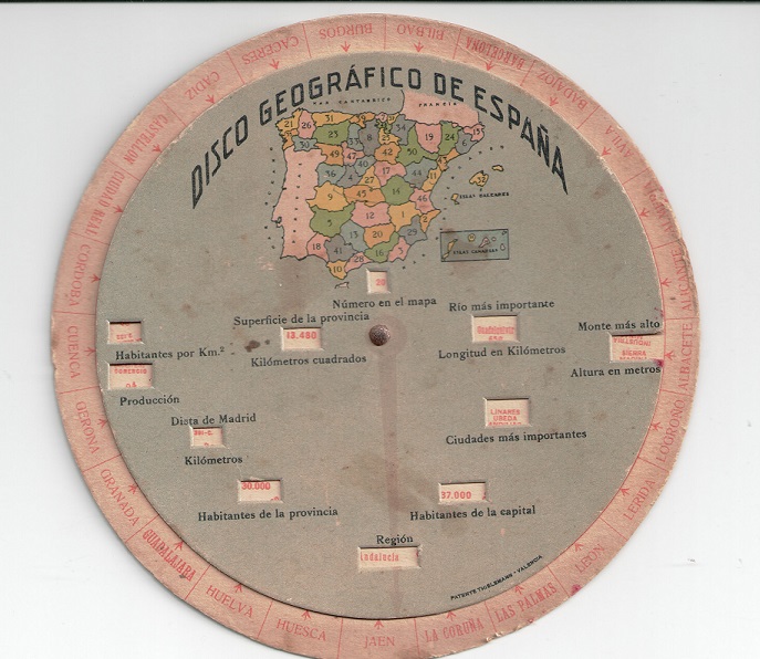 Disco publicitario de Chocolates Amatler con información para representantes de comercio (antes llamados viajantes), viene información de ciudades como habitantes ríos mas importantes, distancia de Madrid, habitantes de la provincia y de la capital, el monte más alto o su producción mas importante