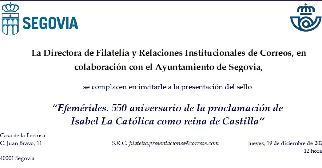 El próximo día 19, en el Ayuntamiento de Segovia, se presentará la emisión de los 550 años de la Coronación de Isabel I de Castilla, no estaré en Segovia y no podré asistir, pero supongo que harán un matasellos de presentación,, y esperemos que sea mejor que el del primer día, no se esmeraron demasiado