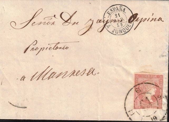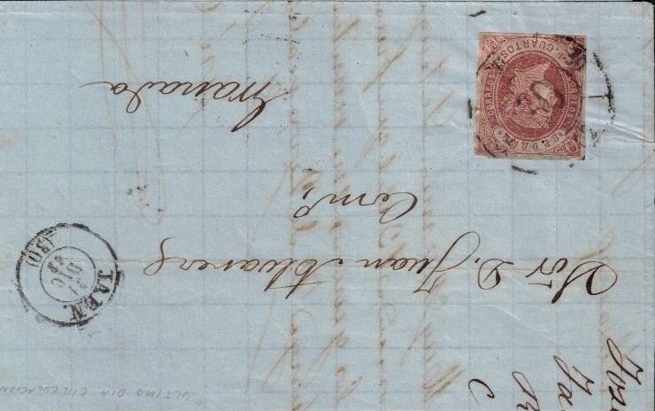 Y termino con una de Zárágózá circulada por via de Jaca y con el matasellos del 1857 utilizado como anulador y el del 1875 como fechador.