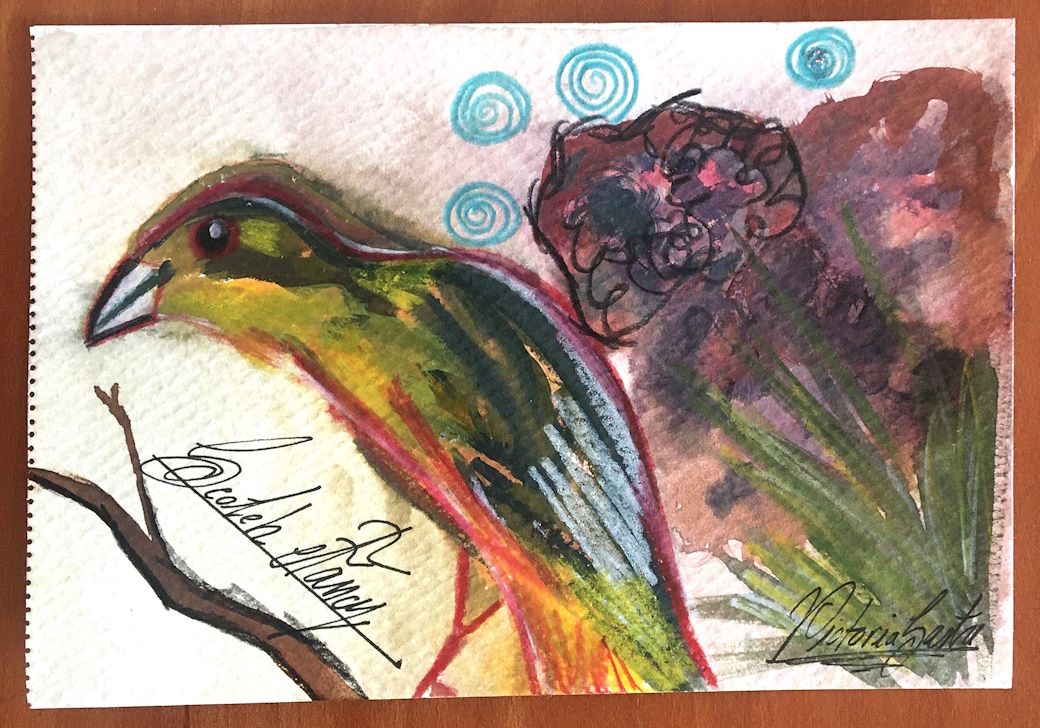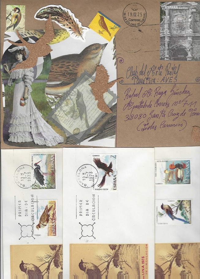 Recibido con fecha de hoy perfectamente, precioso y gran sobre decorado con AVES de nuestra querida Amiga VICTORIA, en el cual además me adjunta como regalo, tres sobres de la serie española de PAJAROS del año 1973, así como dos hojas ampliamente explicativas de su "cariño" por los PAJAROS domésticos, especialmente canarios, periquitos, etc.