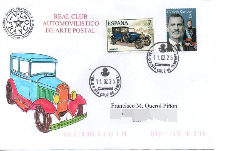 1ª) Ni que decir tiene que esta serie automovilística la he denominado: REAL CLUB AUTOMOVILISTICO DE ARTE POSTAL, porque la carta va lógicamente franqueada con un sello del REY.