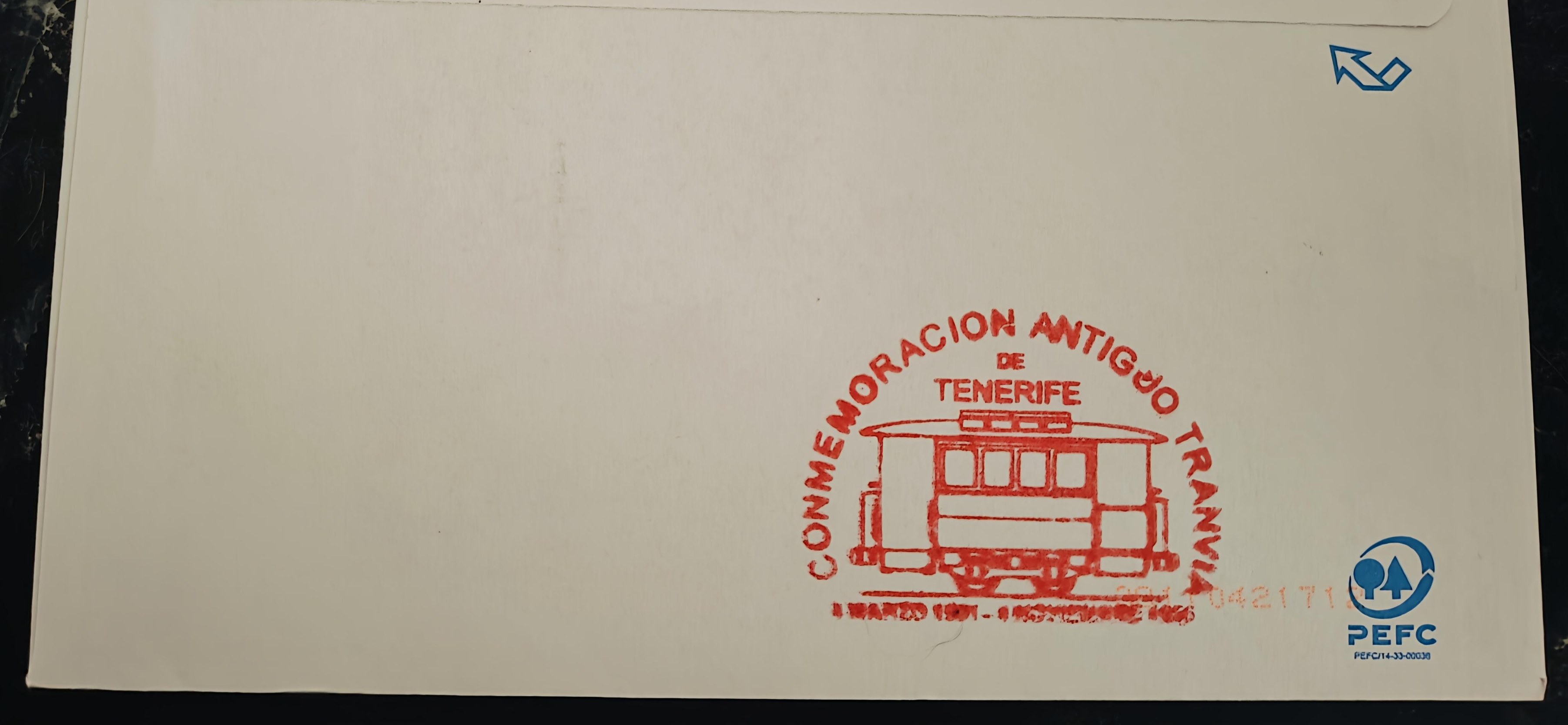 La serie de coches antiguos coloreados a mano hace juego con el sello que acompaña al sobre. Una composición muy estética, acompañada del sello del Grupo Filatélico y Numismático Aguere-La Laguna y del sello conmemorativo del antiguo tranvía de Tenerife.