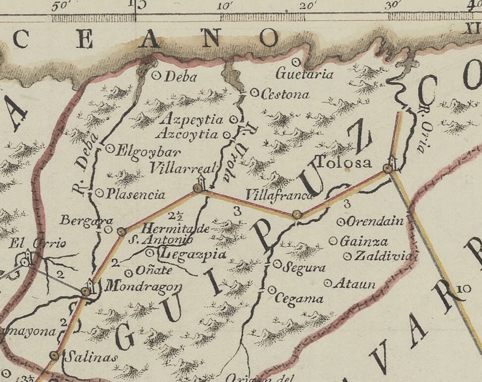 Este último está mejor escaneado y se aprecia que Azcoitia no tiene categoría de estafeta en esas fechas, las estafetas en estos mapas están marcadas con una torre a la derecha del círculo que marca la localidad.