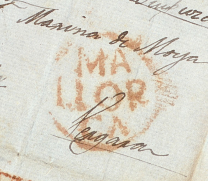 Tizón señala la posibilidad de que sea una marca de llegada de Barcelona, si bien en las siguientes cartas, tenemos dos dirigidas a Barcelona con la marca en el anverso y al dorso se encuentra el fechador de Barcelona en rojo. Nos llamaría la atención que en Barcelona hicieran un doble sellado y con el esmero de realizar una en azul y otra en rojo.