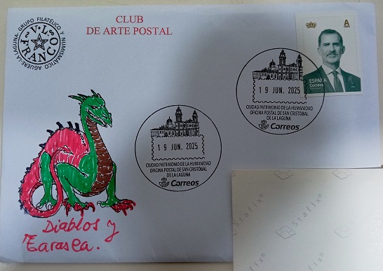 A la espera de que me siga llegando la última pieza de Raúl, aún no recibida, hoy sí me ha entrado en el buzón la de Rafael, con cierto retraso también, probablemente debido a los recortes de personal veraniegos o vacacionales. Perteneciente a su serie 'Diablos y tarasca', y con esa magnífica y nítida estampación del MTUR lagunero que comenta José Luis, me ha servido para repasar el conocimiento de esa sierpe mitológica que es la Tarasca; muy interesante el folleto.