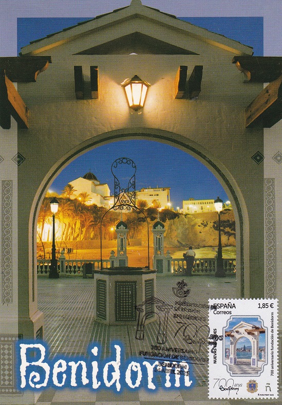 Hace unos días fue la presentación del sello de los 700 Años de la fundación de Benidorm, como me encontraba por allí y el la O.P. Correos les dejaron unos días el matasellos de presentación ha realizado este intento de máximas, aunque frote la postal no se ha estampado el matasellos correctamente.
