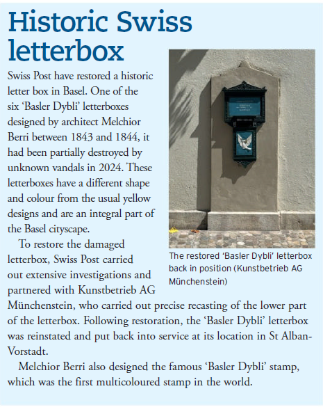 Correos Suizos ha restaurado un buzón histórico en Basilea. Uno de los seis buzones "Basler Dybli" diseñados por el arquitecto Melchior Berri entre 1843 y 1844, fue parcialmente destruido por vándalos desconocidos en 2024. Estos buzones tienen una forma y un color diferentes a los habituales diseños amarillos y forman parte integral del paisaje urbano de Basilea.