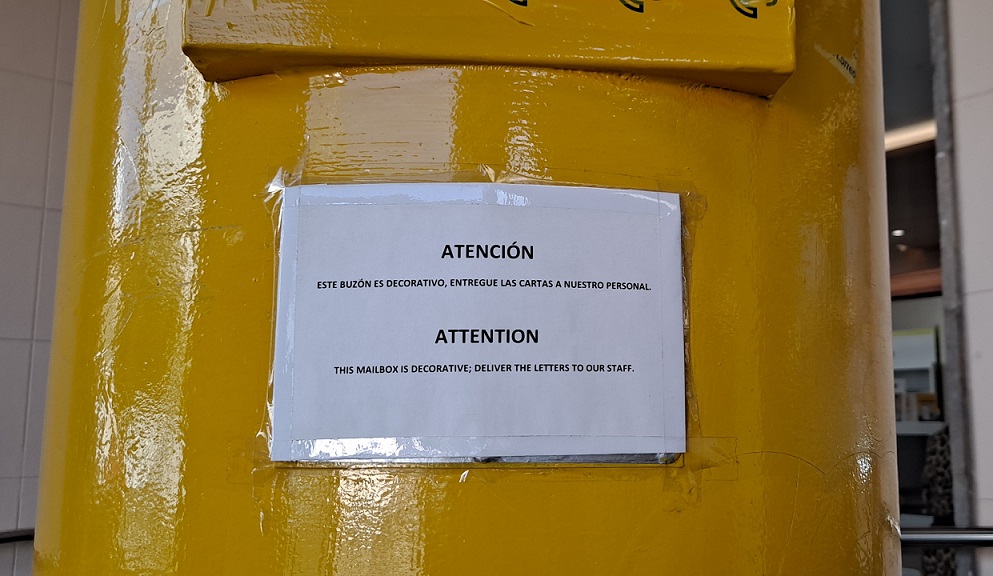 Si el buzón está en uso, depositas las cartas en él y te vas. Si tienes que entrar a la oficina a dejar tu envío tienen oportunidad de venderte algo de su merchandising. El último día que fui a una oficina me ofrecieron (y compré) un cupón de la ONCE para el sorteo supermillonario del mes que viene.