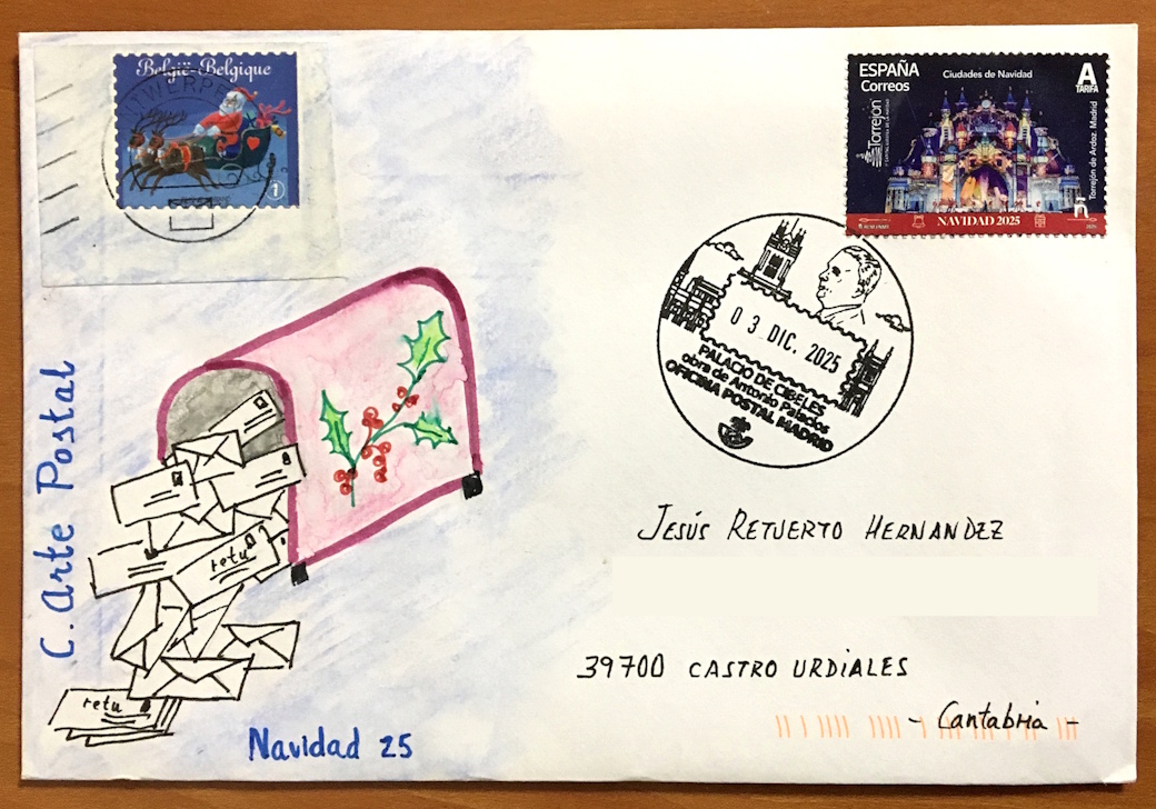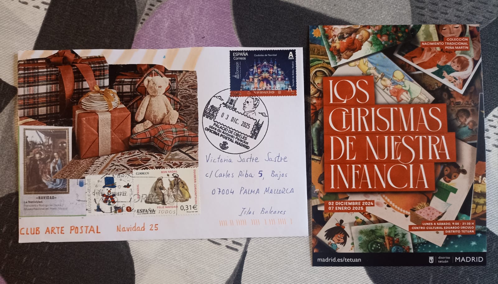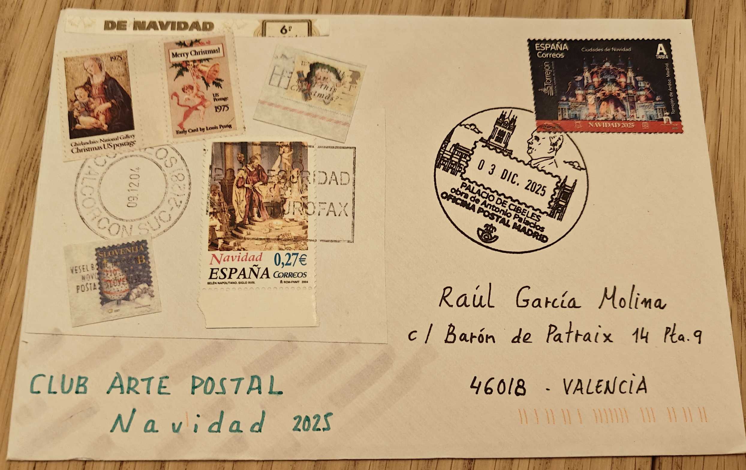 Strumg escribió: 09 Dic 2025, 18:41 Recibida también desde Tres Cruces la carta con contenido del amigo JoséluisG que hace coincidir con una felicitación navideña, precisamente decorado y jugando con texturas y tiempo y creo que un recorte de un burofax y parte de un ¿décimo de navidad? detrás, además de un MTUR del palacio de Cibeles actual, gracias amigo!