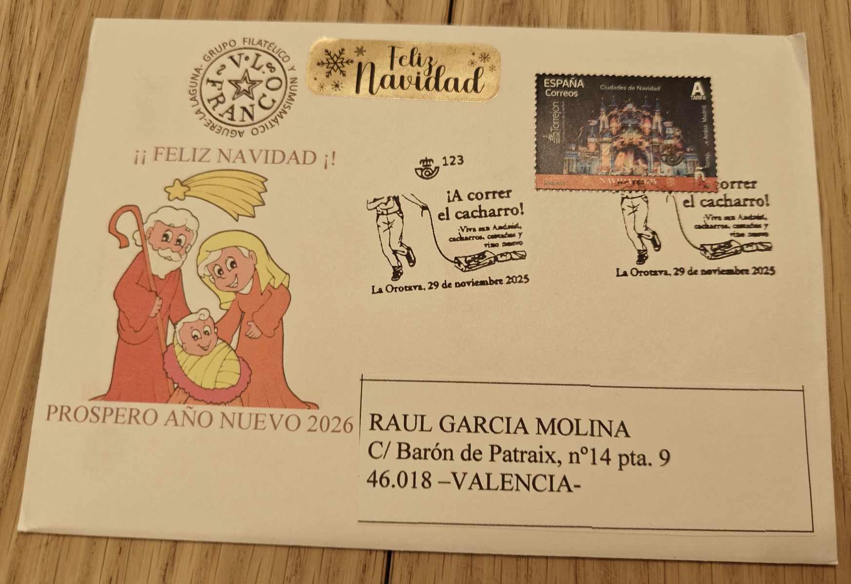 Me llega otro envío, esta vez del amigo Rafael, que aprovecha a felicitar la Navidad con un esmerado sobre y una muy bonita tarjeta con sentidas palabras en su interior. El matasello, "A correr el cacharro" creo que hace referencia a una tradición local tinerfeña en la que los chicos arrastran latas y cacharros viejos haciendo ruido por las calles.
