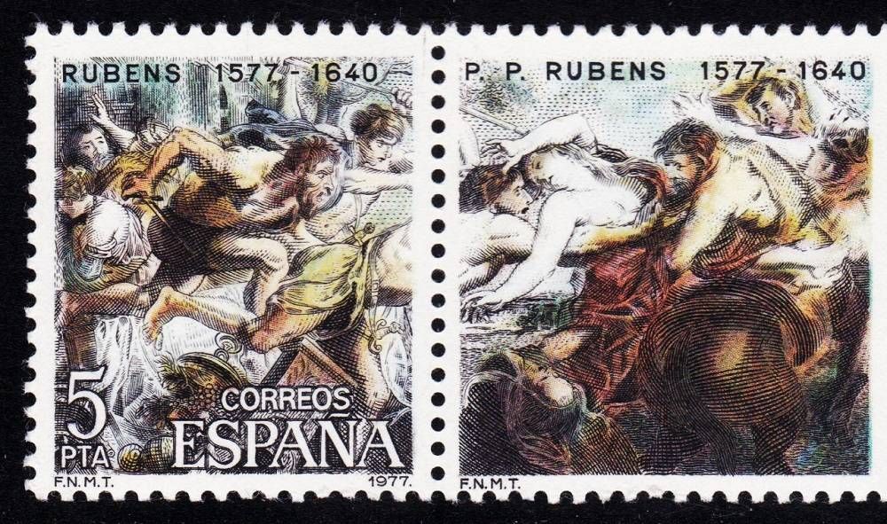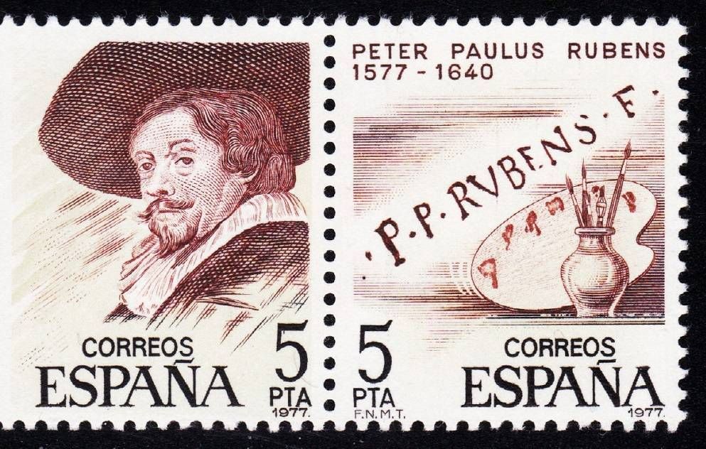 Aniversarios de Artistas, una serie de tres se-tenant, cada uno contiene tres sellos que representan a un artista famoso, su firma y una de sus obras de arte más conocidas. Emitida por España el 28 de marzo de 1978. Grabada por la FNMT (Fábrica Nacional de Moneda y Timbre), aunque no tengo información sobre los grabadores de estos sellos. Escaneé la mitad de cada se-tenant para mostrar el delicado grabado en alta resolución.