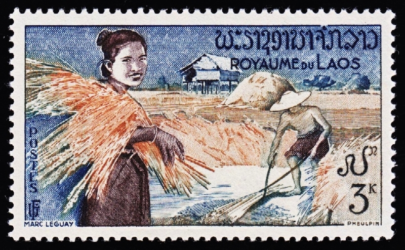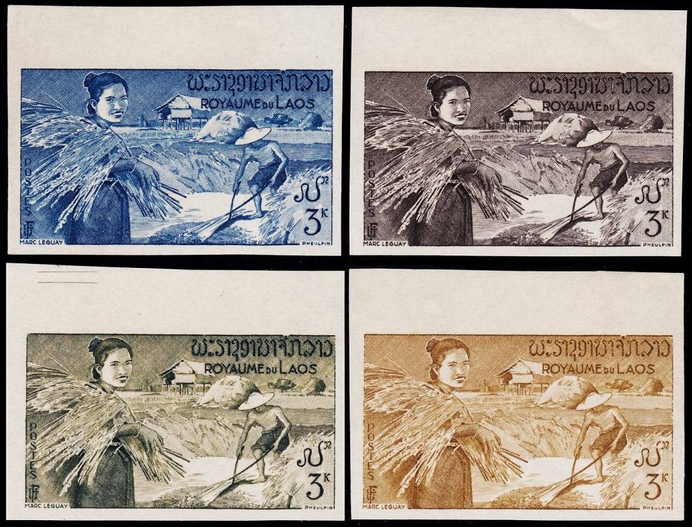 Cultivo del arroz, emitido por el Reino de Laos el 22 de julio de 1957 – Sello y ensayos de color.
