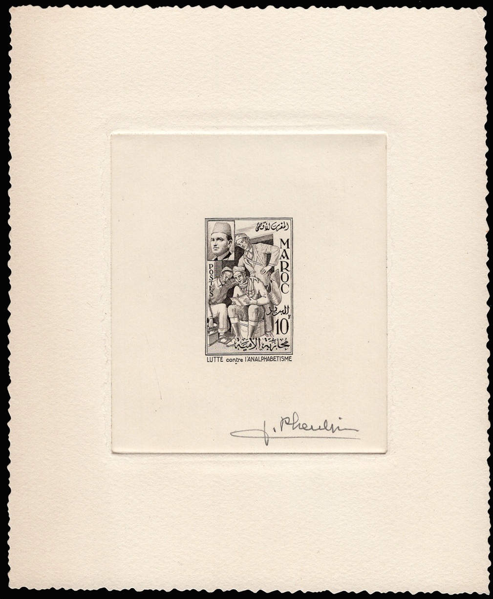 Aquí una prueba en negro del sello de 10F de la serie "Lucha contra el analfabetismo" con su firma a mano.