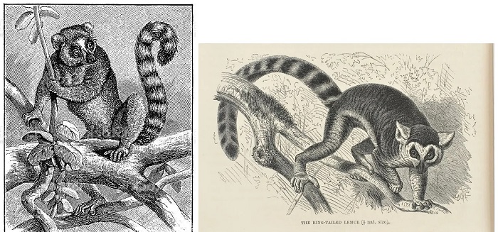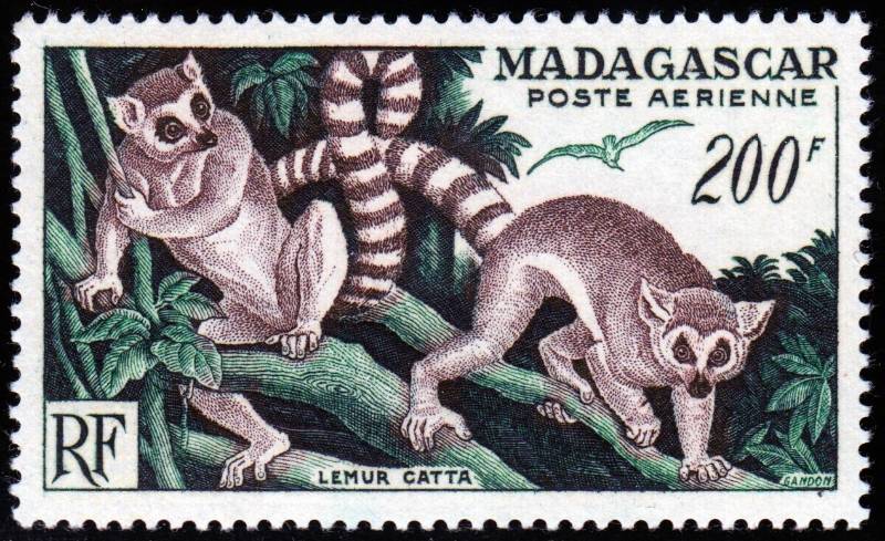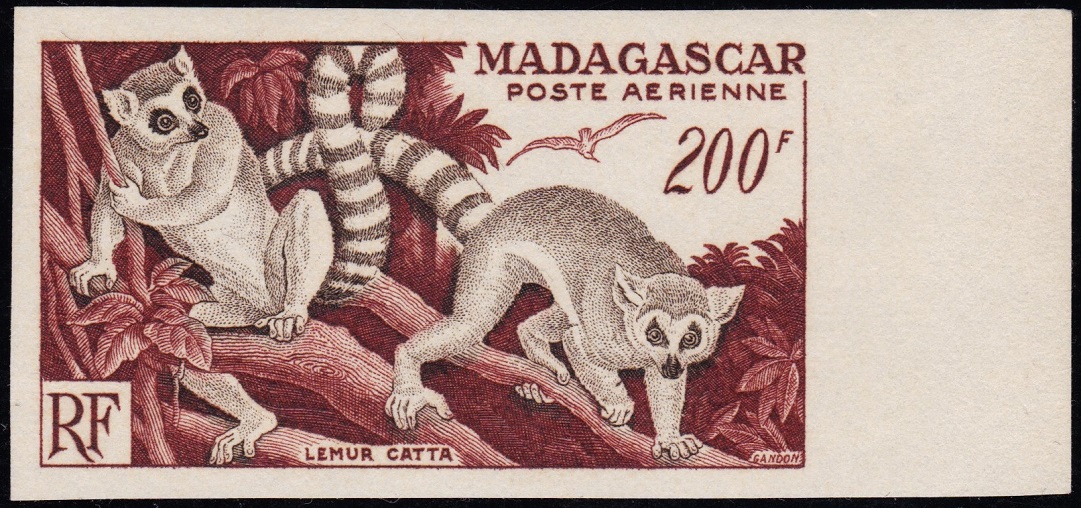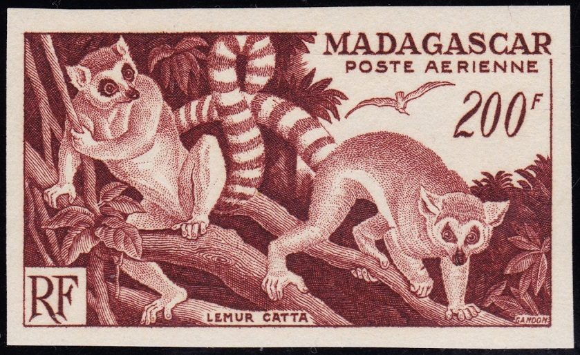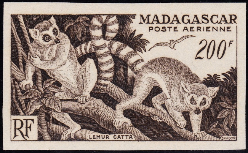 Lémur catta, Madagascar, 1954. Sellos y pruebas de color