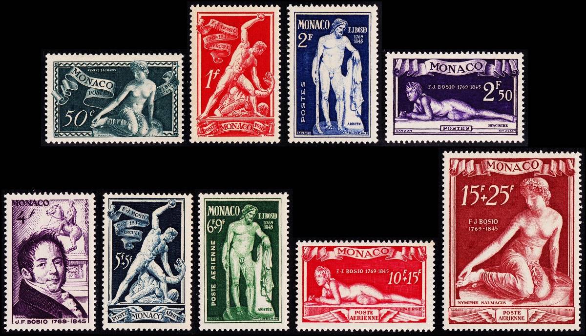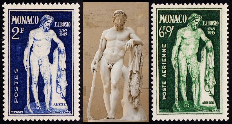 Una de las mejores series de mi colección de sellos sobre mitología griega es la emitida por Mónaco en 1948, que presenta estatuas de figuras mitológicas griegas creadas por el escultor monegasco Barón François Joseph Bosio (1768–1845). Todos los sellos fueron diseñados por Pierre Gandon y grabados por varios grabadores franceses. (Electronic Translation)