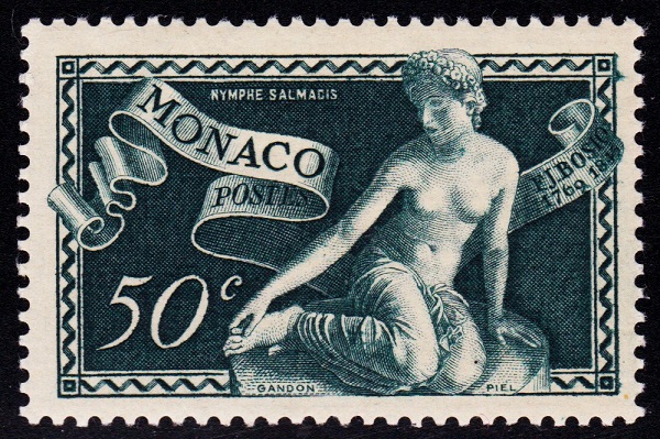Aquí hay dos sellos adicionales de la emisión de Mónaco de 1948. Representan una escultura de la Ninfa Salmacis. Los sellos fueron diseñados por Pierre Gandon y grabados por Jules Piel.