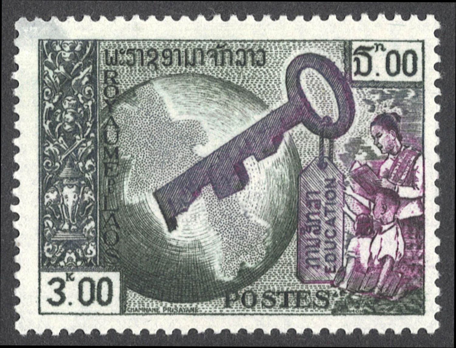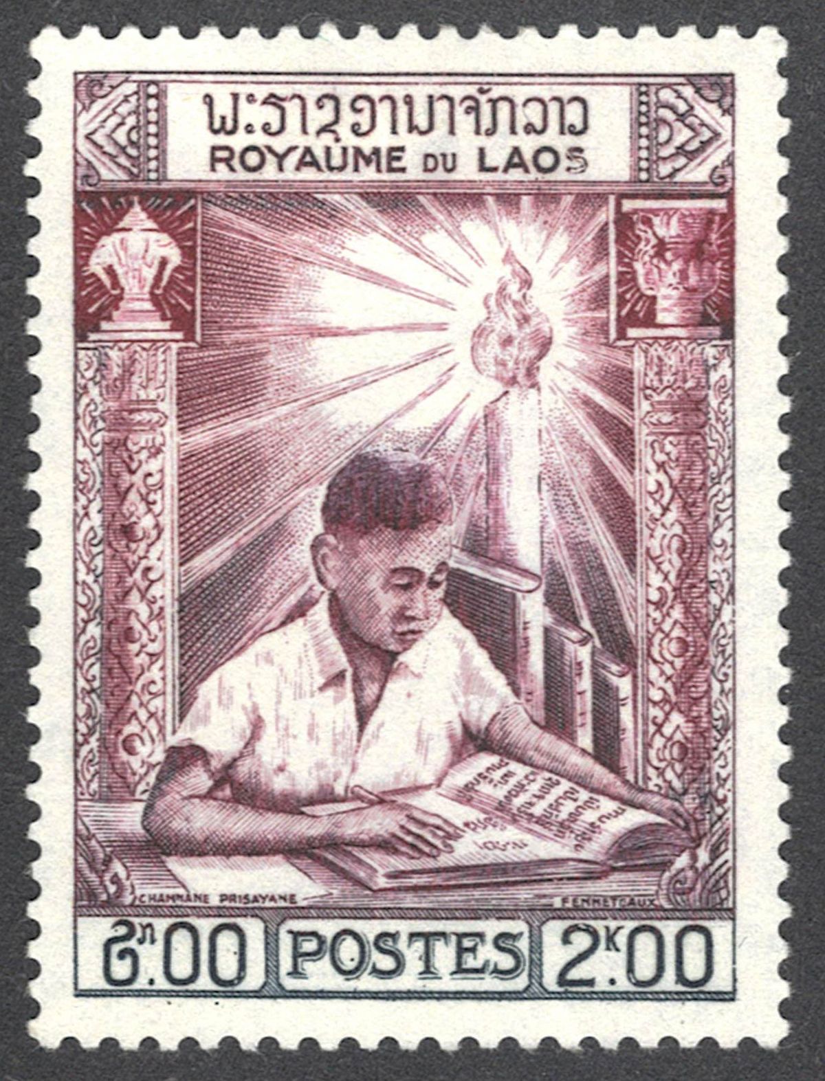 Sellos, también, del Reino de Laos, de 1959, con dos sellos de la serie dedicada a la educación y a las bellas artes ("Education & Fine Arts").