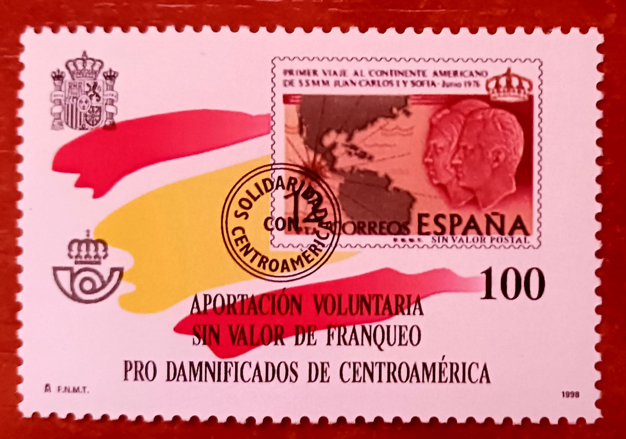 La curiosidad es que me encontré con un sello del que no había hueco asignado en las Hojas. Pensé si sería un error del fabricante. Luego vi que en el catálogo Edifil tampoco aparecía ... Y sobre todo me fijé en el propio sello: se trataba de una viñeta de valor 100 pesetas, sin valor de franqueo.