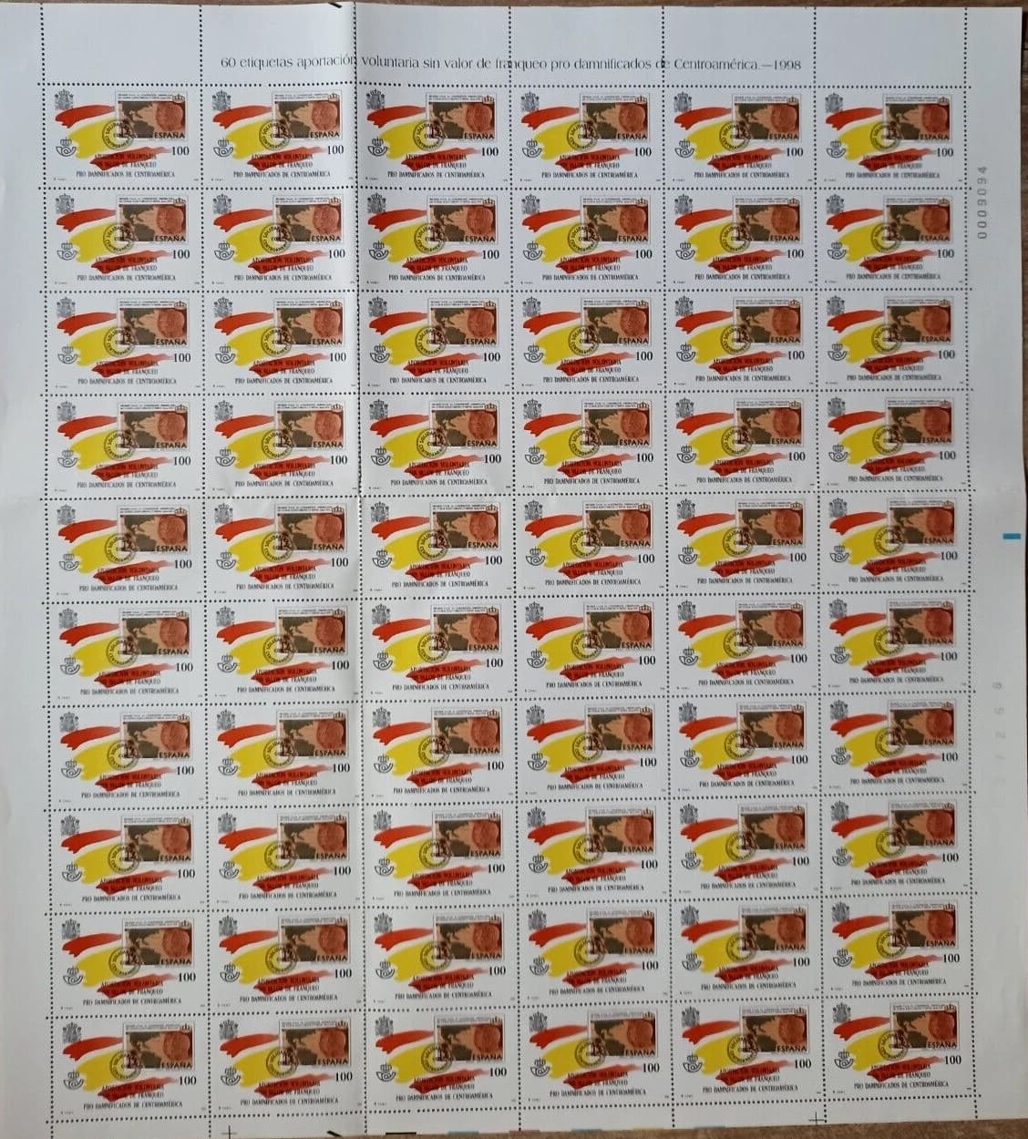 Es una viñeta benéfica emitida por Correos el 11 de Diciembre del año 1998 para recaudar fondos por el Huracán Mich en pliegos de 60 viñetas.