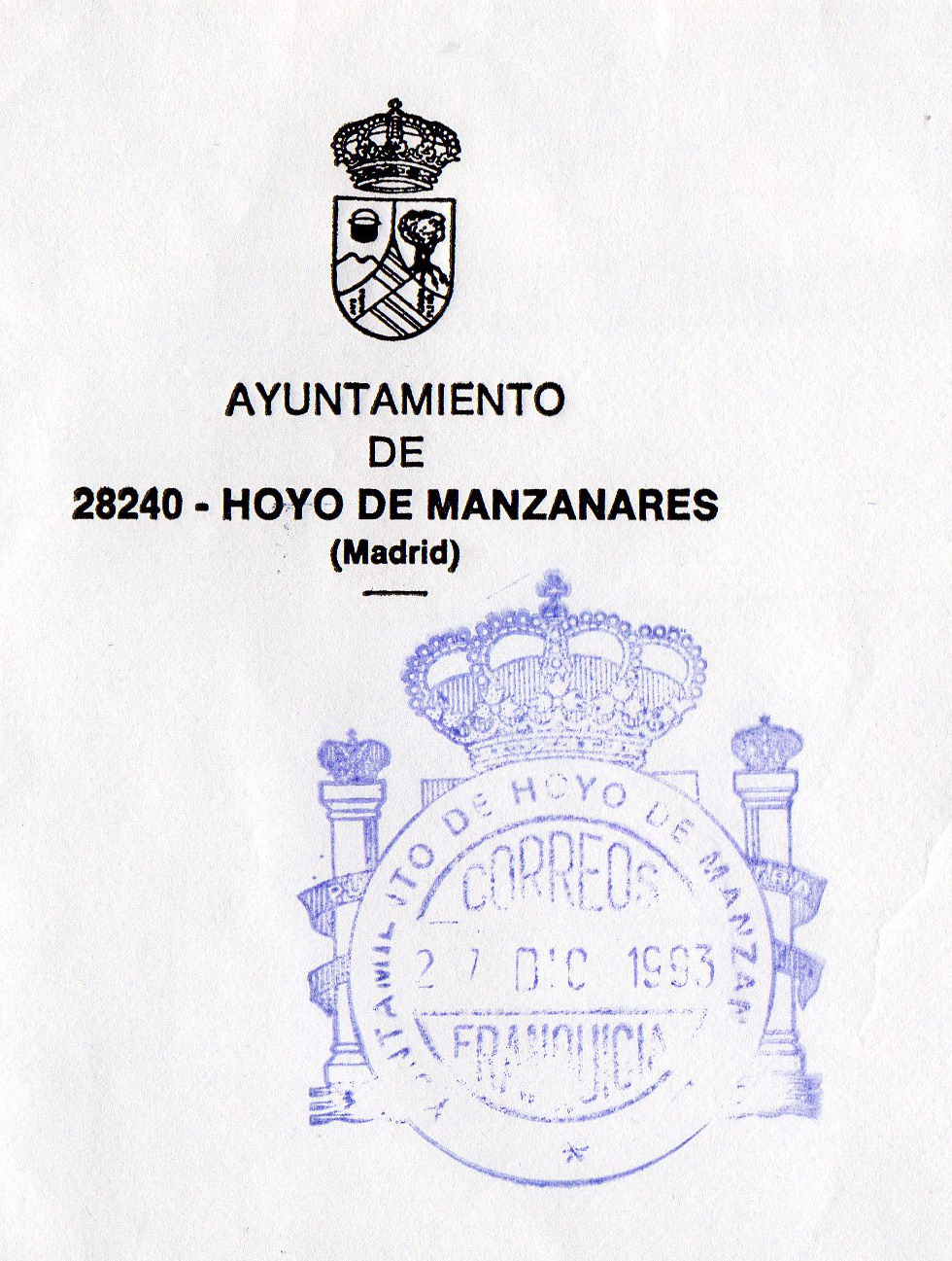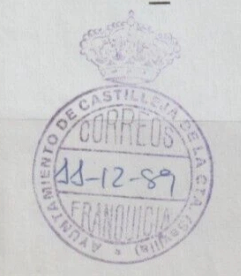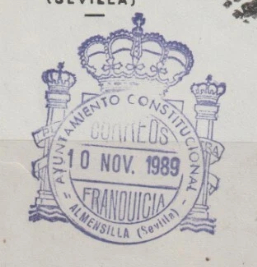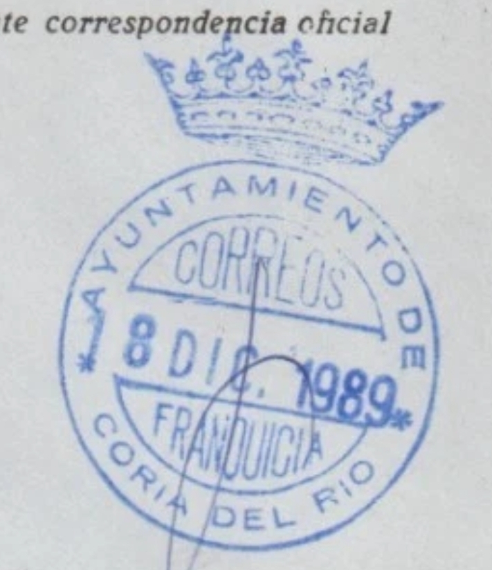 Ayuntamiento de Villaverde del Río. Diciembre de 1990 (por matasellos de la carta). Primer registro.