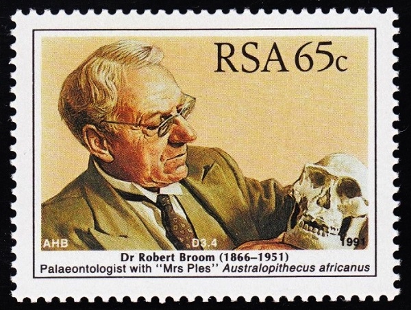 Uno de los cráneos más famosos de A. africanus, llamado Mrs. Ples, fue descubierto en 1947 en Sterkfontein por Robert Broom (1866–1951), un paleontólogo sudafricano. Aquí hay un sello emitido por Sudáfrica el 9 de octubre de 1991 que muestra una famosa foto de Broom con Mrs. Ples.