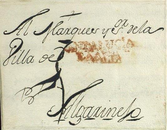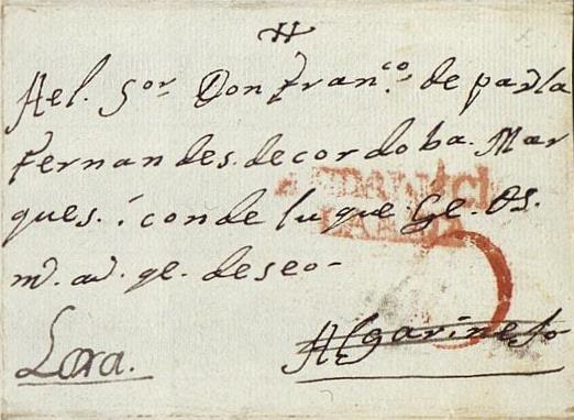 Carta de Lucena a Algarinejo, fechada el 11 de marzo de 1777, con una marca inédita a la fecha, que apenas se distingue, si bien diríamos que es del tipo Andalucía Baxa en dos líneas y en negro.