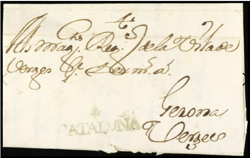 En otro lote presentan esta carta como “1761 (13 junio). BARCELONA a VERGES. Marca +/CATALUÑA (nº 28) en color azul verdoso. RARA, no reseñada en este color.”